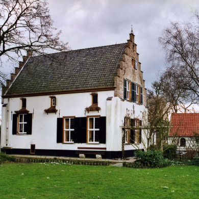 Dwarshuis met verdieping en muurankers, op een waarvan het jaartal 1600. Vensters met luiken.