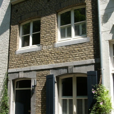 Huis met lijstgevel van Naamse steen, XVIII. Horizontale en verticale reliefbanden, horizontale profiellijsten en geblokte dammen.