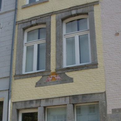 HUIS met smalle lijstgevel, XVIII A, waarin een kozijn van Naamse steen, waarvan het kruis verwijderd is. Bovenverdieping later. Pui modern. Dakkapel met gebogen fronton.