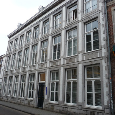 HUIS met zeer brede lijstgevel, XVIII A, voorzien van kozijnen van Naamse steen, die de kruisen, respectievelijk middenstijlen verloren hebben, horizontale en verticale reliefbanden, paneelvullingen en hoekblokken. Ingang vroeger in het midden.