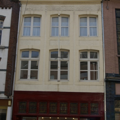 Huis met smalle lijstgevel, XVIII-XIX; en een winkelpui met gietijzer.