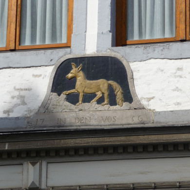 Huis met smalle lijstgevel, voorzien van kozijnen van Naamse steen waaruit de kruisen en middenstijlen verdwenen zijn; verticale reliefbanden onder de vensters; ovale zolderlichten. Gevelsteen 17 IN DEN VOS 56.