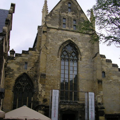 Voormalige Dominicanenkerk en klooster. Kerk met basilicaal schip en veelhoekig gesloten koor, gewijd in 1294; de westelijke traveeën van het schip wat later; de O.L. Vrouwekapel aan de zuidzijde 15e eeuws met 17e eeuwse sluiting. Noordvleugel van het klooster, XVI A, lange gevel met ankers 1663 en in- en uitgezwenkte voorgevel 1660. Op het achterterrein overblijfsels van de eerste ommuring van na 1229, bestaande uit kolenzandsteen (mon.nr.26975).