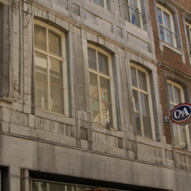 Huis met brede lijstgevel van Naamse steen, XVIII B, met segmentboogvensters, verticale reliefbanden en paneelvullingen onder de vensters en dammen met symmetrisch blad- en schelpornament. Pui modern. Twee dakkapellen met halfronde bovenlichten en gesneden vleugelstukken.