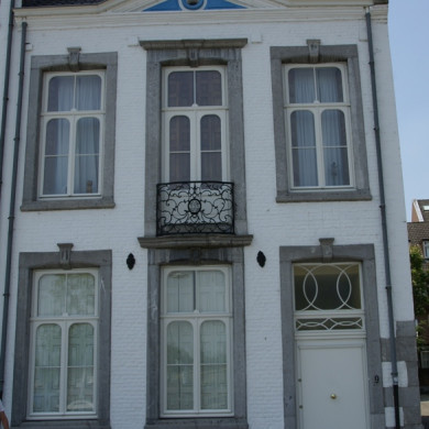 HUIS met lijstgevel, XVIIIc. Segmentboogvensters in hardsteen. Ingangsomlijsting met Lodewijk XV-schildje. Hoog mansardedak, voorzien van dakkapellen met fronton en vleugelstukken. Zijgevel aan de Raamstraat met dichtgemetselde tussendorpelvensters en ovale zolderlichten.