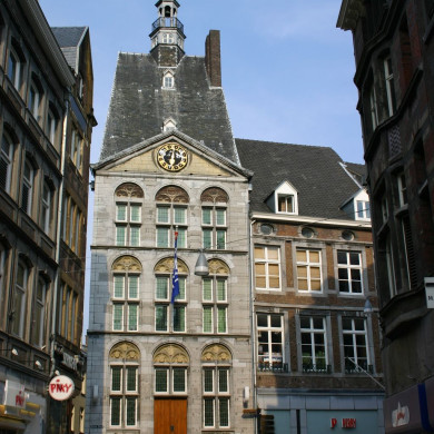 HUIS met lijstgevel, XVIII A, met hardstenen kozijnen, waarvan de kruisen zijn uitgebroken en ovale zoldervensters. Winkelpui modern. Raamhekjes. Achtergevel met overkragend vakwerk. De inwendige constructie rust aan de kant van het Dinghuis op rij en standvinken.