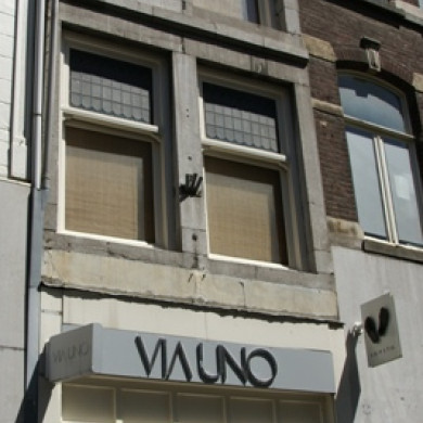 HUIS met lijstgevel, XVIIIc, op de buitenhoeken en de hoeken van het middenrisaliet voorzien van geblokte lisenen. Segmentboogvensters met Lodewijk XV-cartouches. Pui nieuw. Inwendig een Lodewijk XV-plafond. Koofvormige kroonlijst van stuc met putti en Lodewijk XV-ornamenten.
