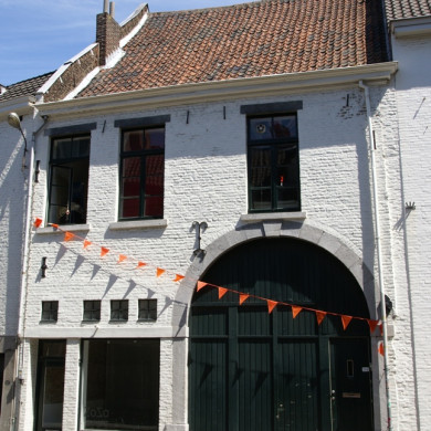 HUIS met lijstgevel. Kozijnen van Naamse steen, die hun kruisen verloren hebben. Gevelsteen met ST VRBANE uit 1766.