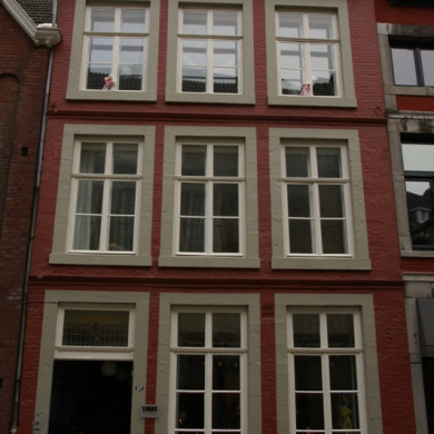 HUIS met brede lijstgevel, XVIII A en later. Hardstenen kozijnen, waarvan de kruisen en middenstijlen zijn uitgebroken, vensters in hardstenen omlijstingen, horizontale profiellijsten en onder de bovenste vensters verticale reliefbanden. Pui rechts gewijzigd.