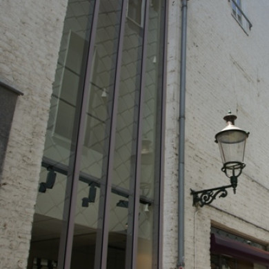 Huis met lijstgevel uit de achttiende eeuw. Segmentboogvensters in Naamse steen. Pui modern.