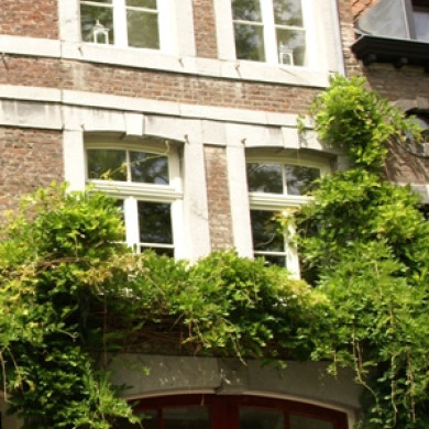 Huisje met lijstgevel, voorzien van segmentboogvensters in Naamse steen en ovale zoldervensters, eveneens in Naamse steen. Segmentboogingang met bovenlicht, geflankeerd door aangekoppelde segmentboogvensters in Naamse steen. Gevelsteen IN DEN WITTEN ENGEL 1765.