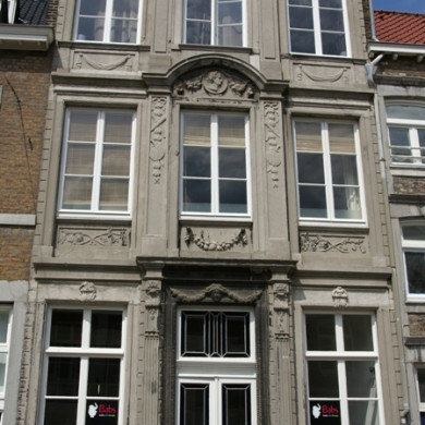 Huis met lijstgevel, XVIII. Segmentboogvensters in Naamse steen. Horizontale reliefbanden. Pui modern.