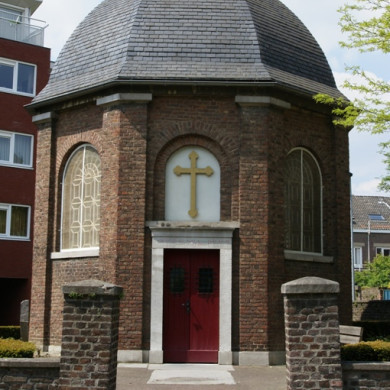 Sint Lambertuskapel, een achthoekig gebouwtje met koepeldak uit 1847. Altaar XVIII. Grafstenen.