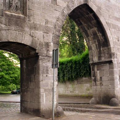OMMURING van de Nieuwstad tussen de rondelen "Haat en Nijd" en "Vijf koppen", uit 1516. De Begijnenstraat komt uit bij de poort "Waerachtig" uit 1886.