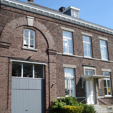 HUIS, XIX A, met ingang en vensters in Naamse steen onder ontlastingsbogen.