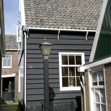 Houten huis. Topgevel met uitgeschulpte windveren en versierde makelaar. Daklijst op consoles.