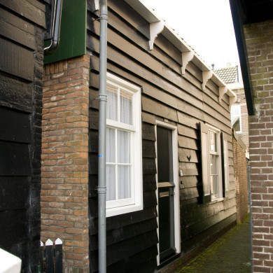 Houten huis met versierde makelaar op een der geveltoppen. Daklijst op consoles.
