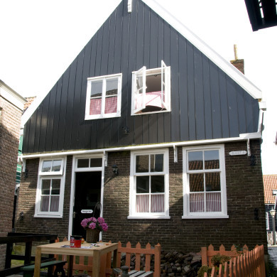Houten huis op bakstenen onderbouw, tegen de helling opgetrokken. Eenvoudige topgevels. Versierde makelaar. Daklijsten op consoles.
