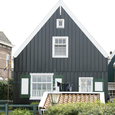 Houten huis met eenvoudige topgevels. Daklijsten op consoles.