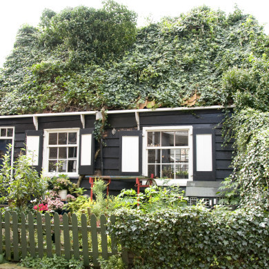 Houten huis in het verlengde van het vorige, met eenvoudige topgevel.