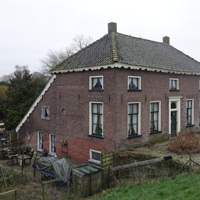 BOERDERIJ onder hoog pannen zadeldak, aan de achterzijde met wolfeind. Eerste helft 19e eeuw. Aan de voorzijde puntgevel met vensters, voorzien van luiken en zesruitsschuiframen. Deur met bovenlicht en omlijsting door pilasters en hoofdgestel.