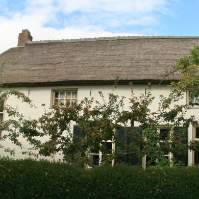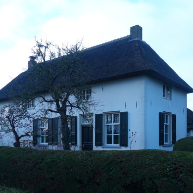 Boerderij op T-vormige plattegrond, eerste helft 19e eeuw. Het gepleisterde links onderkelderde woonhuis heeft een rieten schilddak en vensters met zes- en achtruitsschuiframen.