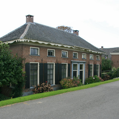 Dubbel HUIS met verdieping en pannen schilddak, geschulpte houten daklijst. Vensters met luiken en zesruitsschuiframen; deuren in omlijsting met hoofdgestel. Midden 19e eeuw.