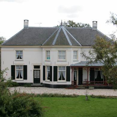 Gepleisterde HERENBOERDERIJ uit het midden der 19e eeuw. Driehoekig uitgebouwde middenpartij, pannen schilddak. Parterre met verdieping. Stalgedeelte achter en dwars op het woonhuis.