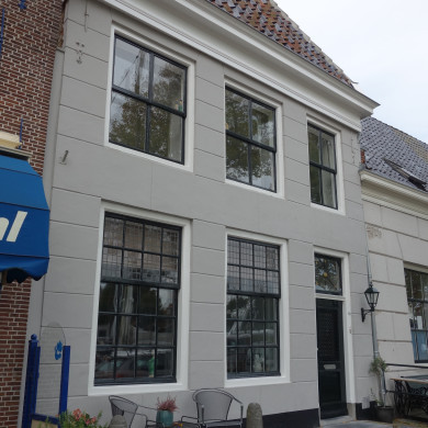 Laag pand onder dwarskap; gevels gepleisterd; mooie midden 18e-eeuwse deur.