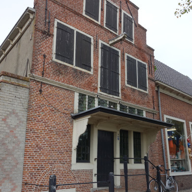 Pand met 17e-eeuwse trapgevel; pui modern, stoep met marmeren tegels.