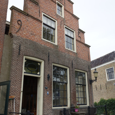 Recht afgesloten gevel met roeden in de vensters voor wellicht ouder pand. Stoep.