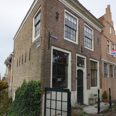 Recht afgesloten gevel met roeden in de vensters voor wellicht ouder pand. Stoep.