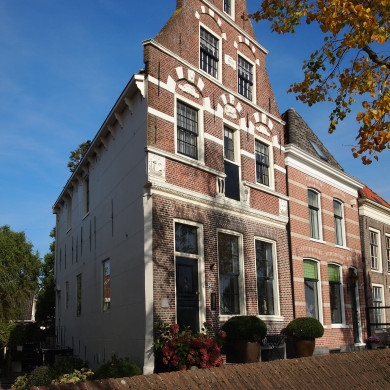 Pand onder zadeldak tegen rijk met gevelstenen, banden en blokken versierde gevel uit 1656 op gesneden puibalk; top afgeknot, pui XVIII.
