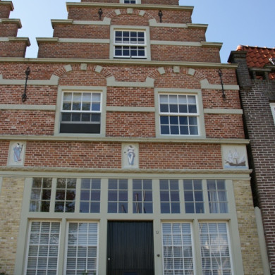Pand met door lijsten en banden doorregen trapgevel op gesneden puibalk. In Pand met door lijsten en banden doorregen trapgevel op gesneden puibalk. In het fries gevelstenen. Pui jonger.