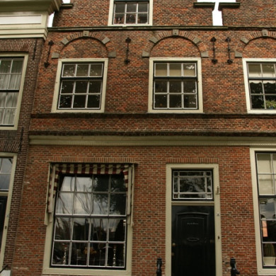 Pand met gepleisterde recht afgesloten gevel met in de strekken boven de vensters gebeeldhouwde kopjes. Stoep en dijkbalie.