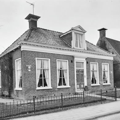 Woonhuis onder laag schilddak met hoekschoorstenen waarop borden; geblokte kroonlijst, zesruitsvensters, dakkapel.