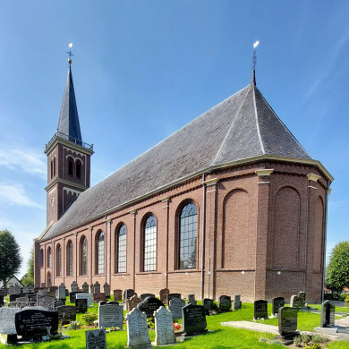 Herv. Kerk. De in 1874 op zeer ruim omheind kerkhof herbouwde kerk bezit de volgende te beschermen inventaris; 17e eeuwse preekstoel met achterschot en klankbord, bijbehorend doophek, twee 17e eeuwse herenbanken, waarvan een overhuifd; wapenbord Camstra; vijf rijk gebeeldhouwde 16e eeuwse zerken en twee dergelijke 17e eeuw. Orgel met Hoofdwerk, Bovenwerk en vrij Pedaal. In 1861 gemaakt door W. Hardorff. In de toren grote klok uit 1473. Op het kerkhof dienstgebouwtje onder hoog schilddak met aan de lange achtergevel drie, aan de voorgevel twee zesruitsvensters. Omlopende houten goot. Inleiding NEDERLANDS HERVORMDE KERK. Op een zeer ruim door beukenhagen omheind kerkhof gelegen kerkgebouw met forse uitbouw aan noordzijde (waarin transept en sacristie), opgetrokken in 1874 in eclectische trant op de fundamenten van een voorgangster ( timmerman/aannemer firma M. en J.P. Boonstra te Menaldum). Steenformaat, kleur en detaillering van transeptarm en sacristie verschillen van elkaar, hetgeen zou kunnen duiden op twee verschillende bouwfasen. Zekerheid kon hierover echter niet worden verkregen. De TOREN is blijkens de gedenksteen gebouwd in 1866 naar ontwerp van J.I. Douma uit Leeuwarden (aannemer L.R. Wybrandy uit Franeker). Het verhoogde KERKHOF (met traditionele staande en liggende zerken welke van lokaal belang zijn en niet van rijkswege worden beschermd) is toegankelijk via twee vernieuwde tweede helft 19de-eeuws gietijzeren toegangshekken. Aan de zuidzijde van het kerkhof ligt een verdiepingloos vermoedelijk laat-18de-eeuws DIENSTGEBOUWTJE. Opvallende elementen zijn voorts nog de twee lindenlanen aan de noord-oostzijde die aanlopen op koor en sacristie respectievelijk de noordzijde van het kerkhof begrenzen.