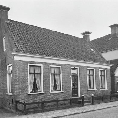Eenvoudig dorpshuis onder zadeldak tussen zijtopgevels met schoorstenen waarop borden.