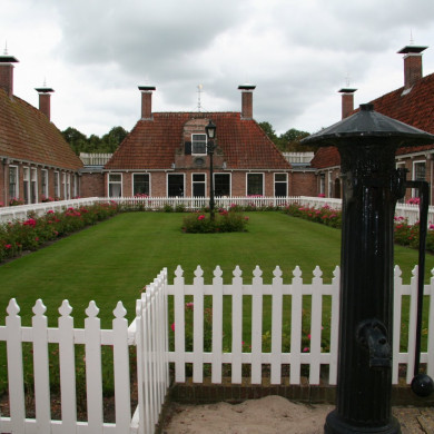 Popta-Gasthuis, bestaande uit vier vleugels en een hof en tussen de huizen aan de Buorren een rijk gebeeldhouwd toegangspoortje 1713.