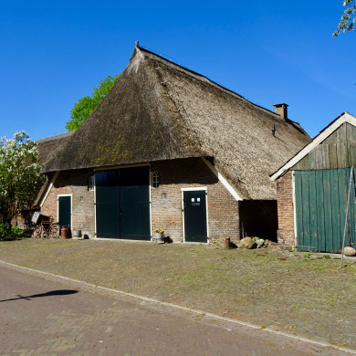 Boerderij met achterbaander waarboven overstekend rieten dakschild.