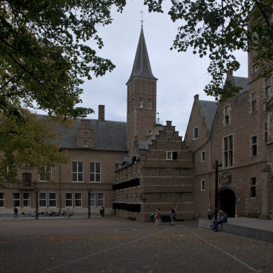 TOEGANGSPOORT met traptoren, gebouw van baksteen met zandstenen lijsten, eerste helft zestiende eeuw. Boven de korfboog van de doorgang een wapensteen derde kwart zeventiende eeuw. In de doorgang een vlak kruisgewelf met rozetten en een Lodewijk XVI kruiskozijn met zij- en bovenlichten.