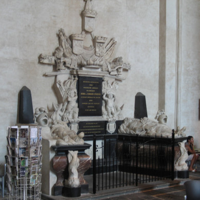 Abdijtoren, aangebouwd tegen de zuidmuur van de Koorkerk; door brand geteisterd in 1471, 1568, 1712 en 1940. Van de grond af achtkant, drie geledingen, deels XIII, bekleed met natuursteen. Op de hoeken steunberen met vijf versnijdingen.