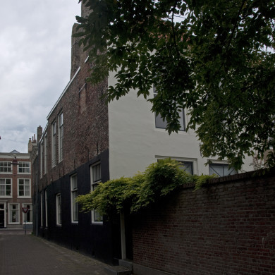 Gepleisterd pand, 17e of 18e eeuw, met lijstgevel en dakkapel in het zadeldak.
