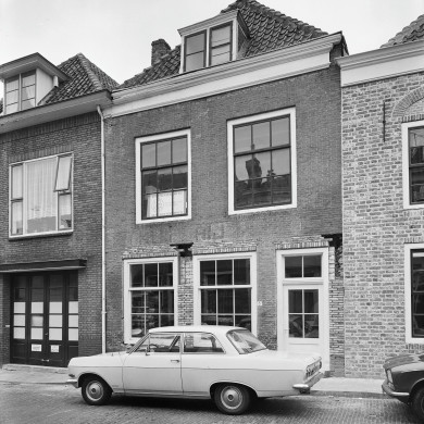 Huis met geverfde lijstgevel, aan de hoeken ingezwenkt. Winkelpui met middendeur, XVIII-XIX.
