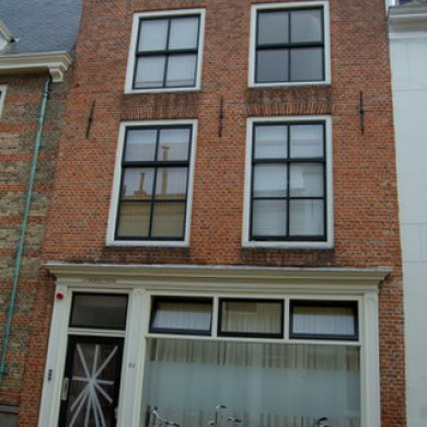 Dwarshuis genaamd "De Schalierotse", met hoog door leien gedekt zadeldak. Gedateerd 1616. In de gele metselsteen rode banden en onder de door klossen gedragen gootlijst rode ornamenten van baksteen. Voordeuromlijsting in eenvoudige Lodewijk XVI-stijl. Stoep. XVII-XVIII.