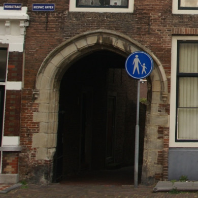 Doorgang met brede gotische, met peerkraal geprofileerde zandstenen poortomlijsting. Toegang afgesloten door smeedijzeren hek, XVIII. Deze poort is overbouwd door het pand Nieuwe Haven 1.