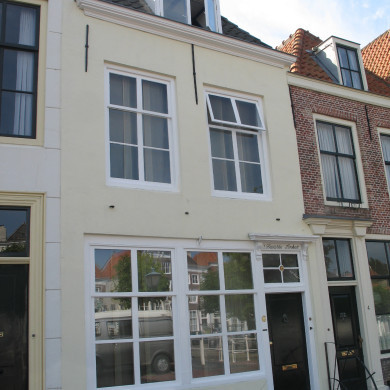 Huis met geverfde rechte gevel. Eenvoudige voordeuromlijsting. XVIII.