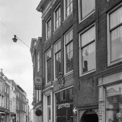 Huis met rechte gevel, lijst met eenvoudige consoles. Winkelpui. XVIII.