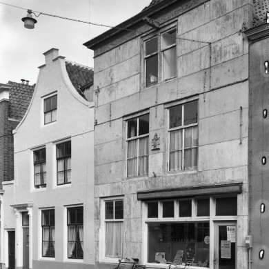 HUIS met gepleisterde lijstgevel. Gevelsteen met jaartal 1649 en zakkendrager. Winkelpui. XVII-XVIII.