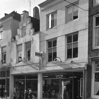 Combinatie van gepleisterde lijstgevel, XVIII-XIX en gepleisterde trapgevel, XVII. Gecombineerde winkelpui.